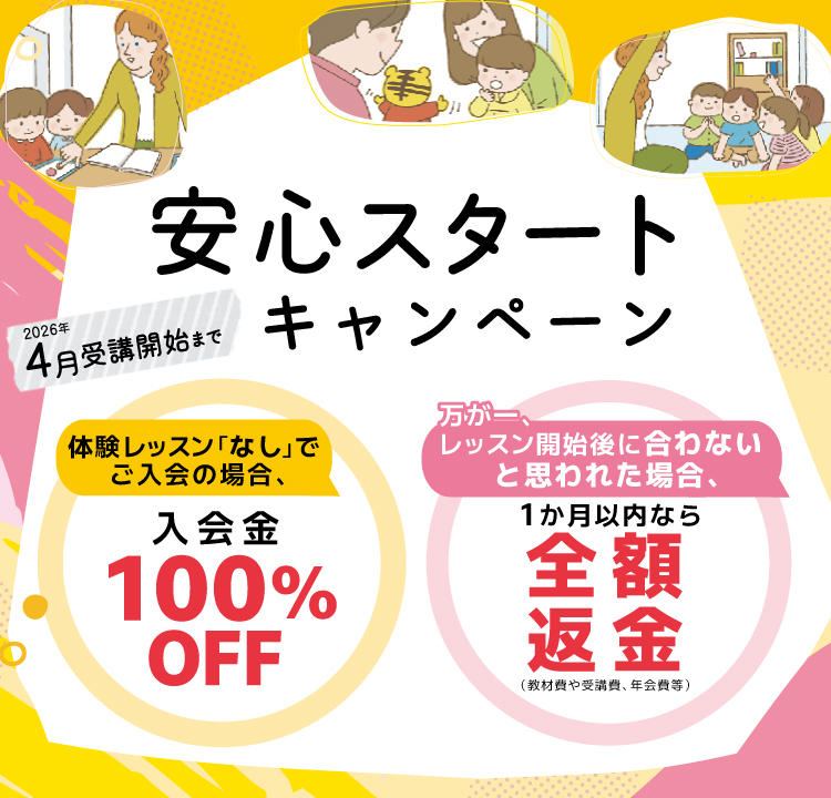 安心スタートキャンペーンでのご入会希望のかたは、無料体験レッスンお申込みフォーム(オレンジ色のボタン)の「ご質問・ご要望」の欄に「安心スタート希望」とお書きのうえお申込みいただくか、お客様サービスセンターまでお電話でご相談ください。